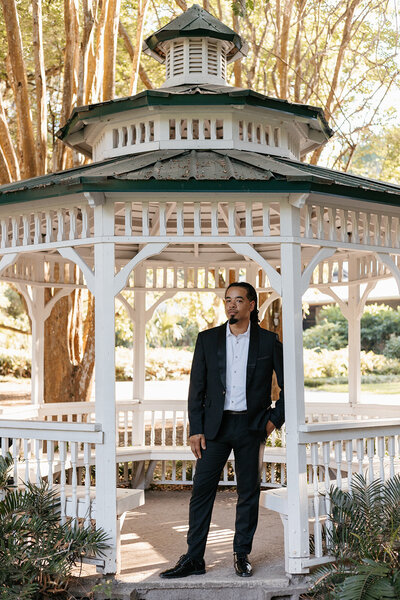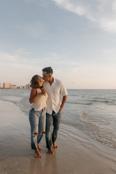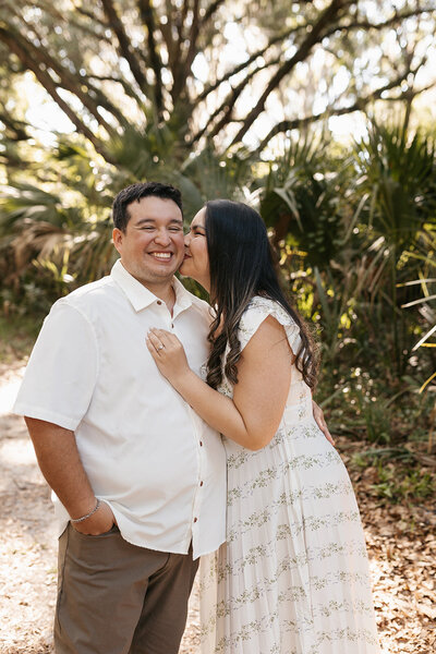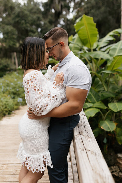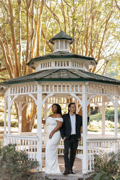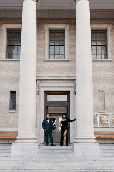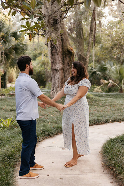 If one partner does opt or a pattern, the other should wear a solid color to balance the look.